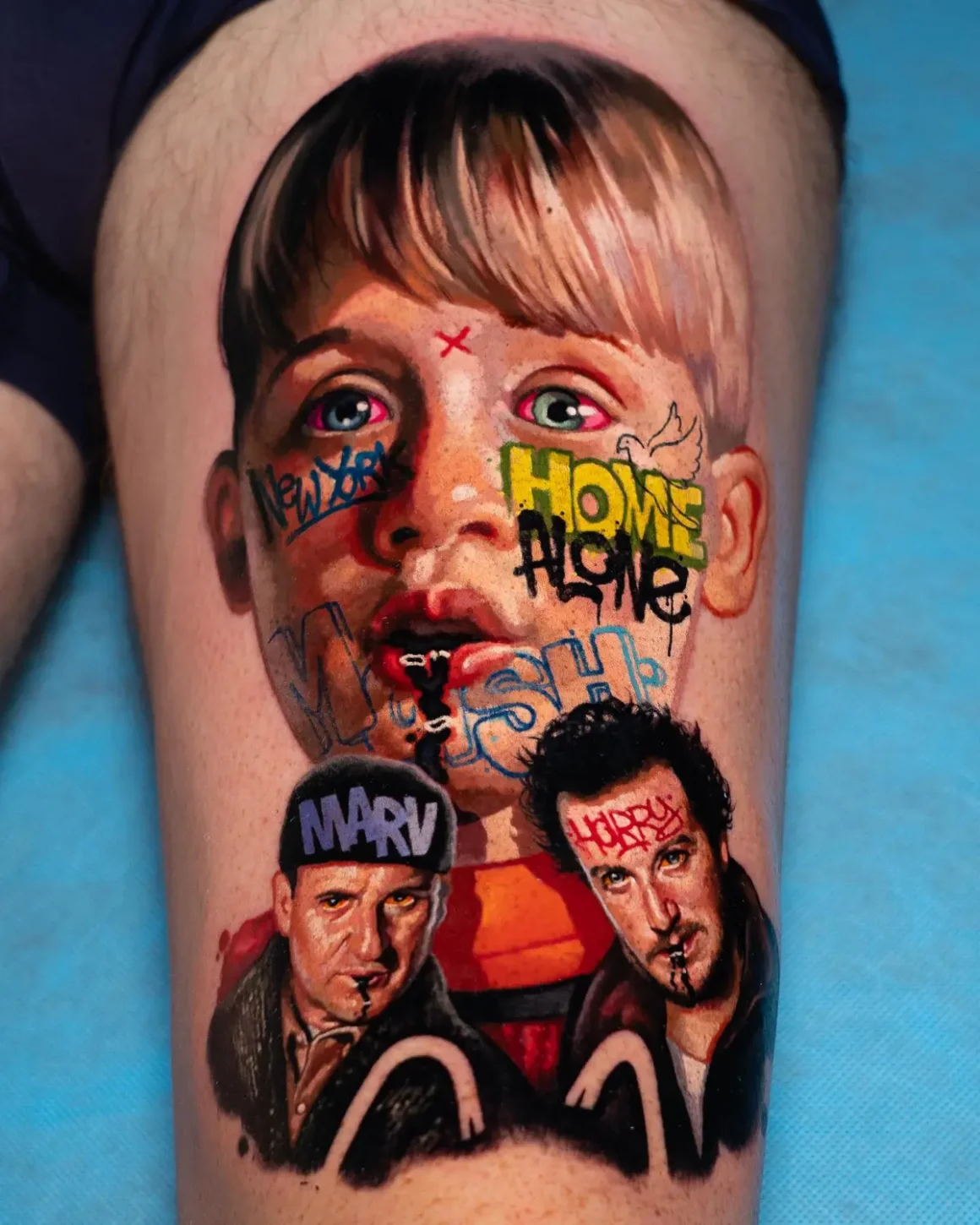 In 1990, a Christmas movie hit the theaters that changed the meaning of Christmas chaos and childhood heroics forever. As captivated onlookers watched Kevin McCallister, the accidentally abandoned kid outsmart and defeat two bumbling burglars deemed the “Wet Bandits” with a masterful prank-filled plan, the Home Alone franchise became an instant holiday classic. This Christmas season, we’re celebrating the film’s legendary cultural impact the best way we know how; through bold, nostalgic tattoo art inspired by Kevin, the Wet Bandits, and the movie’s most iconic scenes.
