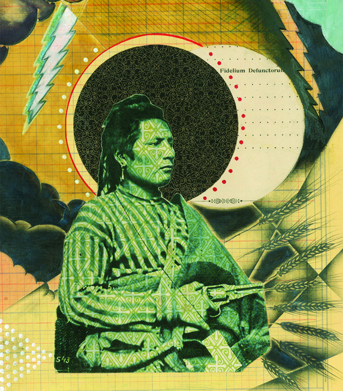 I’d have to say the mural I did up at Idyllwild Arts Academy titled “Mergers & Acquisitions.” That piece is about the unstoppable force of exponential growth and “manifest destiny.” It’s a collage of two photos by Roland Reed of some Blackfoot Natives on cliffs from around 1912 overlooking downtown Los Angeles. It’s about 40 feet wide on the library there. It’s like going back in time and seeing what’s coming; for my ancestors it was tragic. But again, it’s important for me to represent that side of my lineage and that story as a contemporary native artist today.