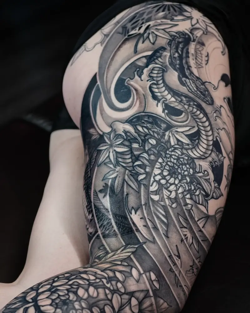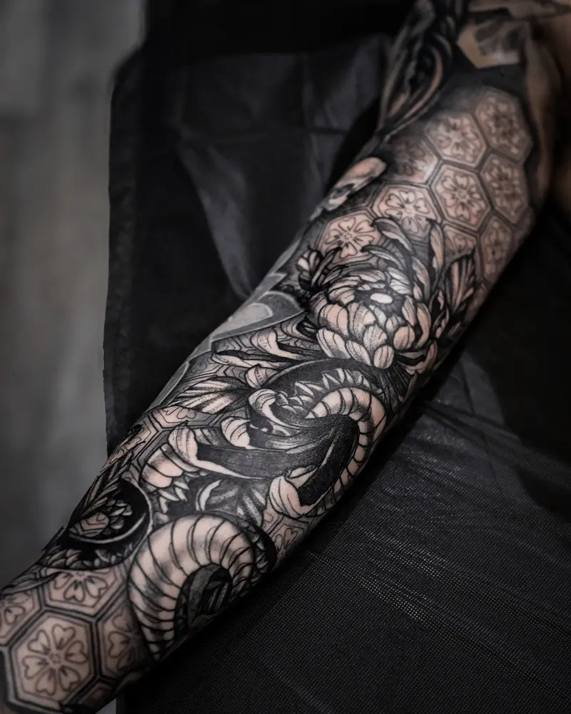 Located just off the Las Vegas Strip, Serpent Noir Tattoo was established in early 2020 and is proudly Hispanic-owned. The shop specializes in large-scale tattoos, Japanese-style pieces, sacred geometry, and black-and-gray work, with color tattoos becoming an exciting recent addition. Owner George, who grew up in San Fernando, California, and is now fully established in Las Vegas, has a background in Japanese-style work, high-contrast designs, mandala line work, and even dabbles in oil painting. With 14 years of tattooing experience, he still remembers the days of scrubbing his own tubes and continues to better his craft while making the shop a more artistic space every day.