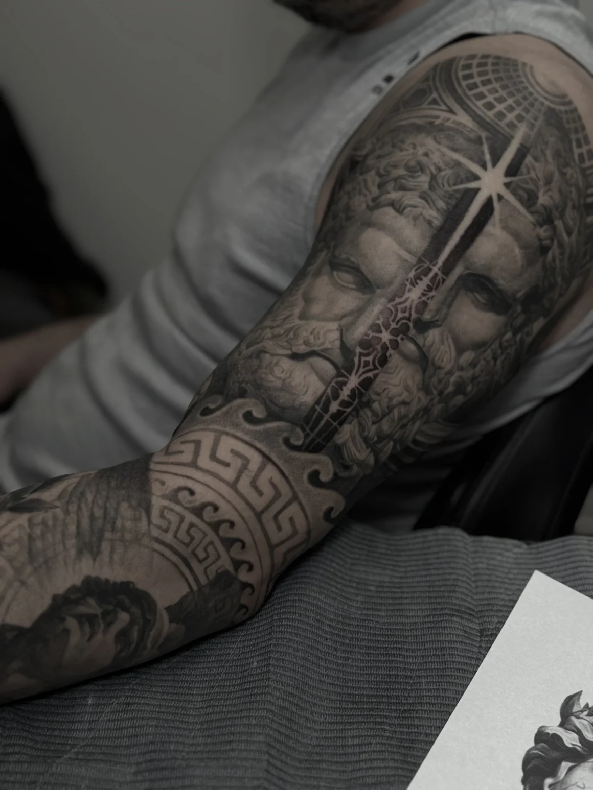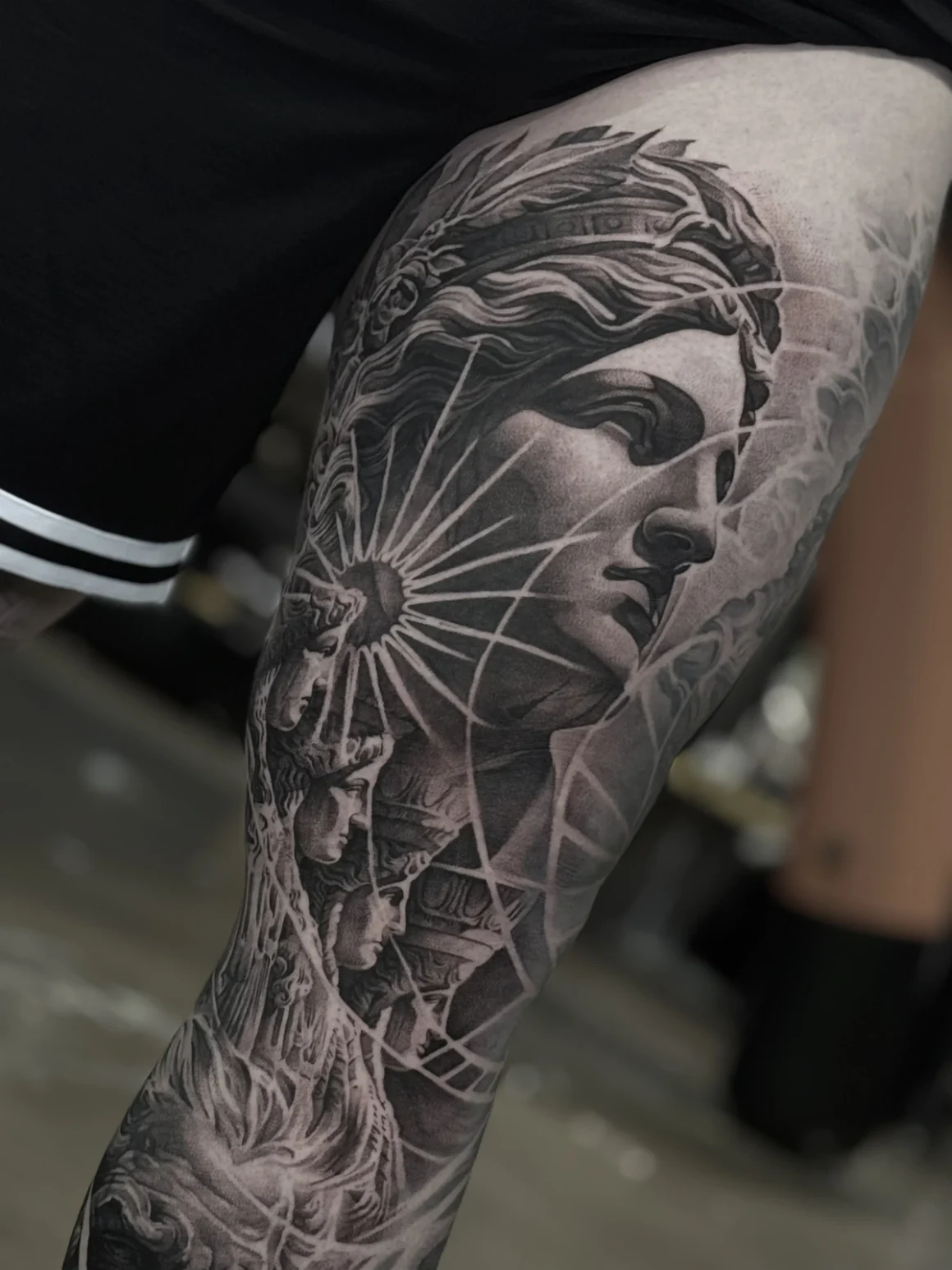 His process starts before the machine is even running, but not in the way artists usually describe it. Conversations with clients aren’t just about ideas, they’re about placement, movement, and how the design will sit on the body long term. From there, he studies references pulled from sculpture, mythology, and anatomy, building compositions that are meant to move with the body instead of sitting on top of it.