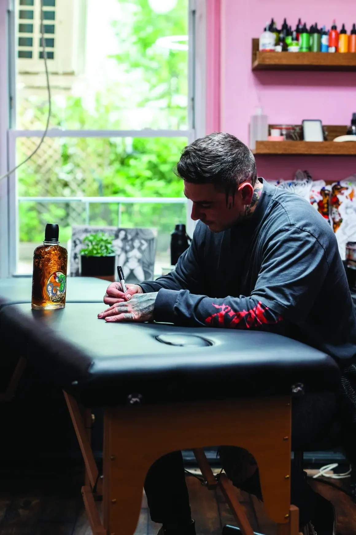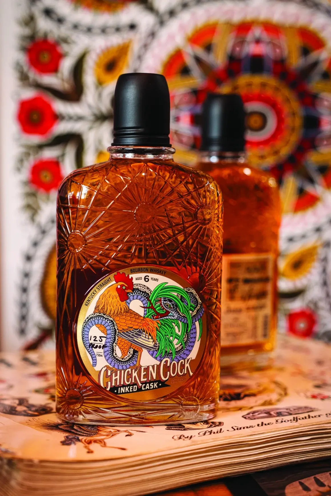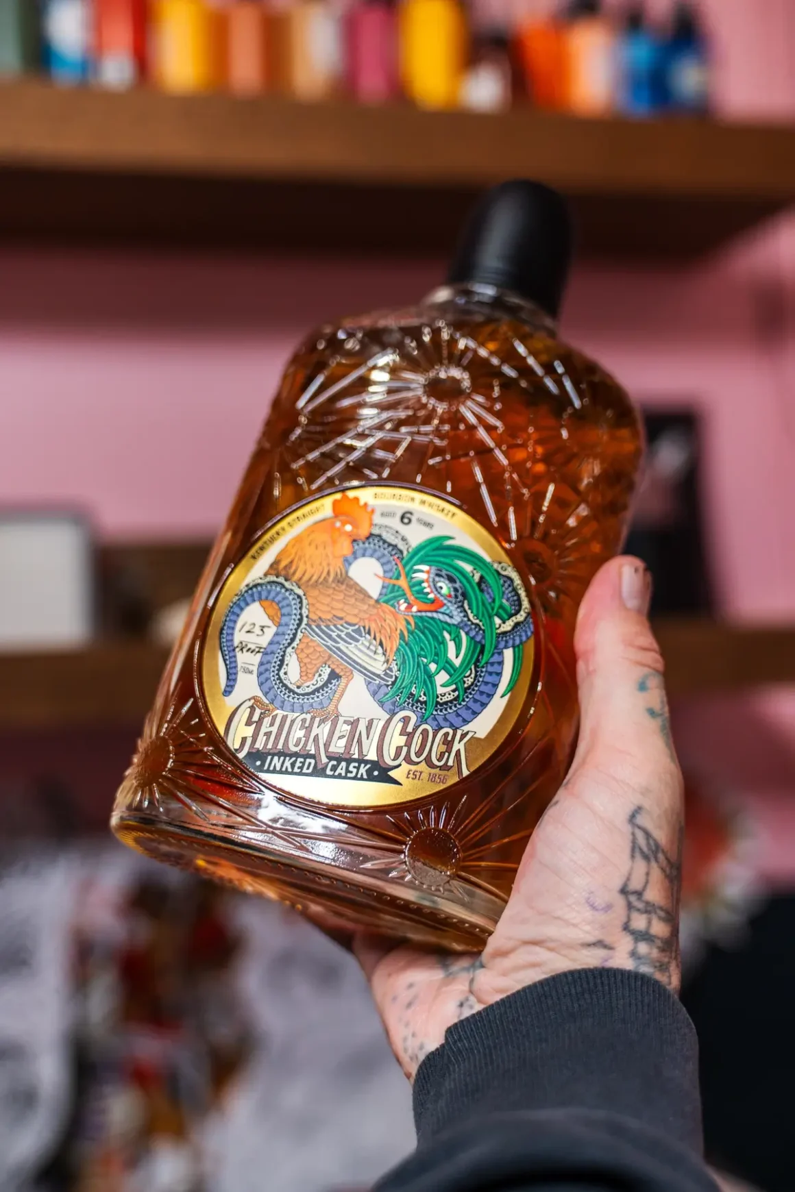 “Tattoos are and have always been a way of expressing something internally on the outside,” says Grain & Barrel Spirits Vice President of Marketing Tyler Rothenberg, explaining, “This form of expression deeply communicates and differentiates the human experience in a unique and individualized way. Much like the way Chicken Cock Whiskey immediately stands out through its name and ability to share a very unique story rich with heritage and legacy. Each symbolizes a deep sense of pride and the fearless pursuit of authenticity.”