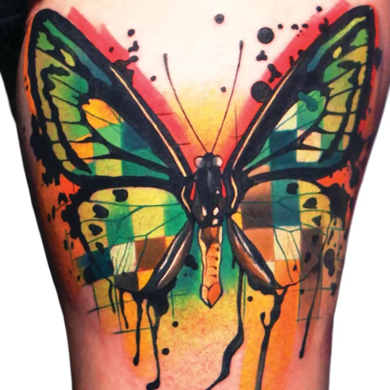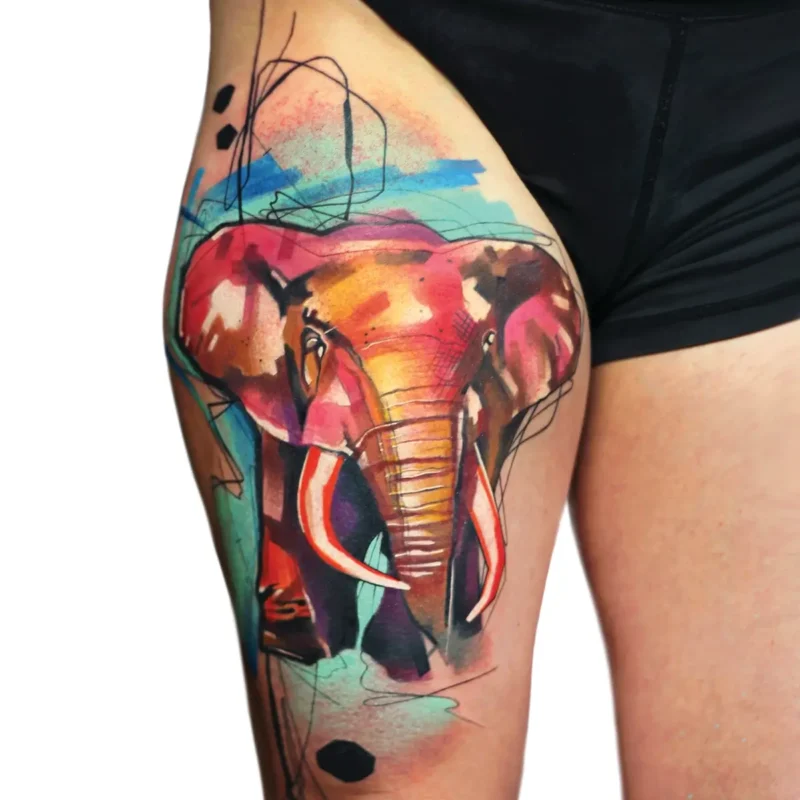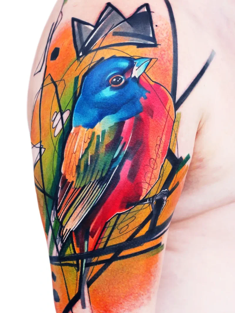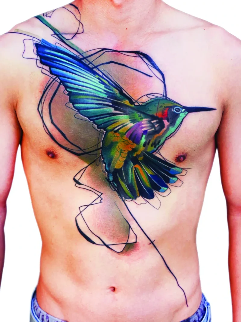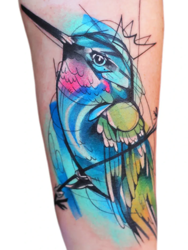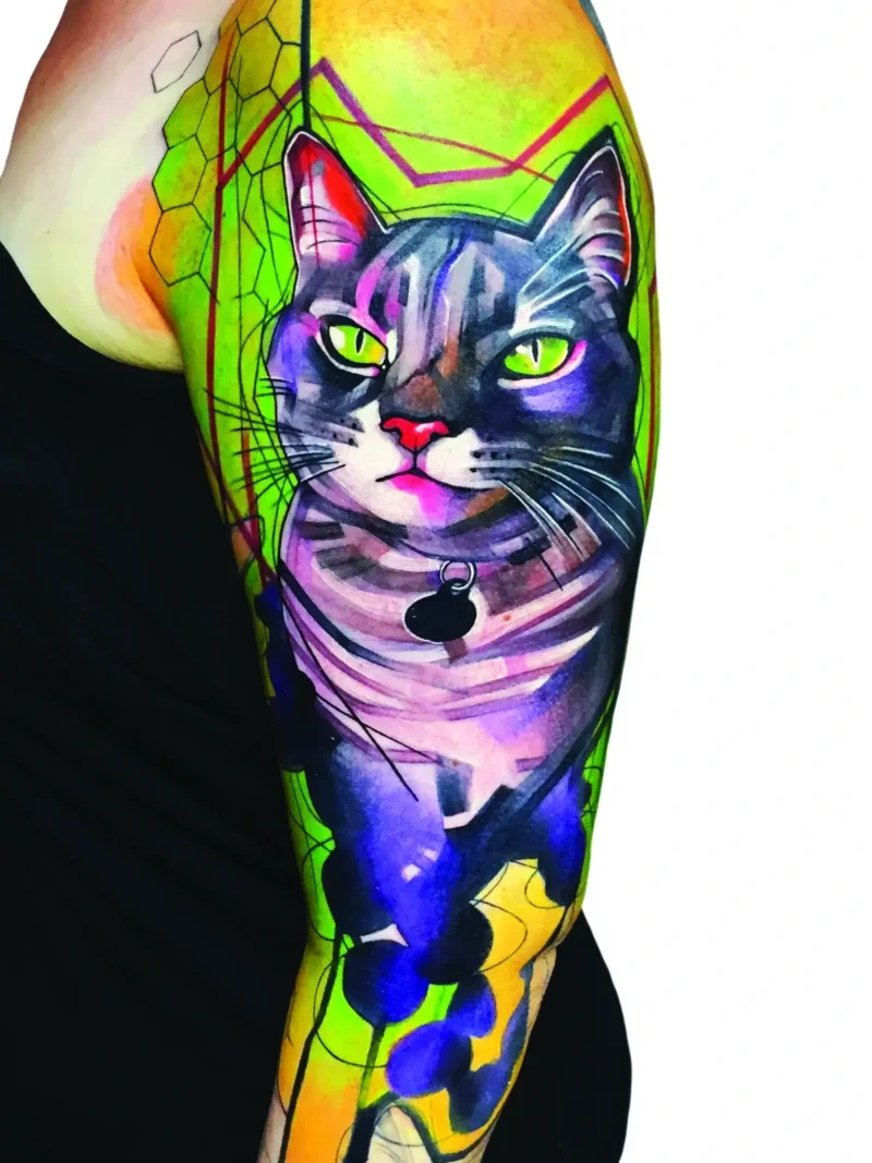 Belakova describes her tattooing style as “funky color,” blending vibrant hues with representations of living entities, prismatic artworks that evoke emotional sentiments of intensity comingled with calmness. “Funky color is storytelling on skin,” she explains. “It’s graffiti, street art, abstract expressionism, and childhood imagination all colliding at once. I tattoo in layers, exaggerated lines, wild textures, emotions that don’t sit still, like me. There’s always movement. Always something beneath the surface.