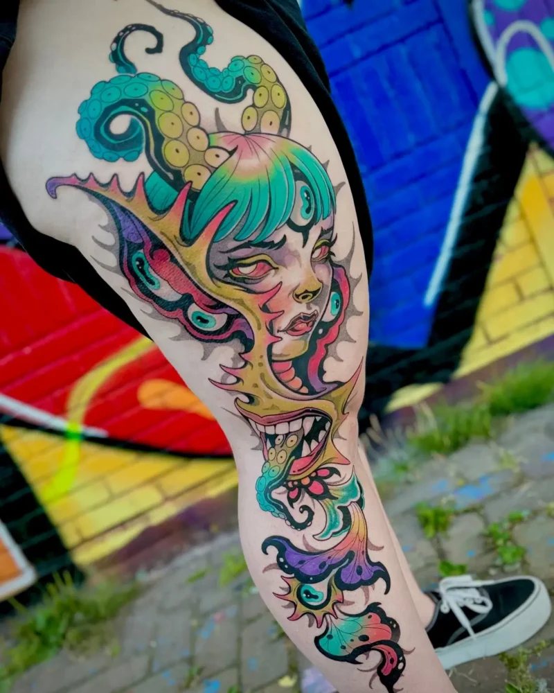 Rockin Rabbit shares a background in graphic design and illustration and was a schoolmate of Carlos. After years of guest spots and conventions across Europe, she developed a distinctive illustrative style blending neotraditional, blackwork, and psychedelic influences. This approach results in her high-contrast, whimsical “Bunnyverse” tattoos, recognizable by their signature googly-eyed characters.