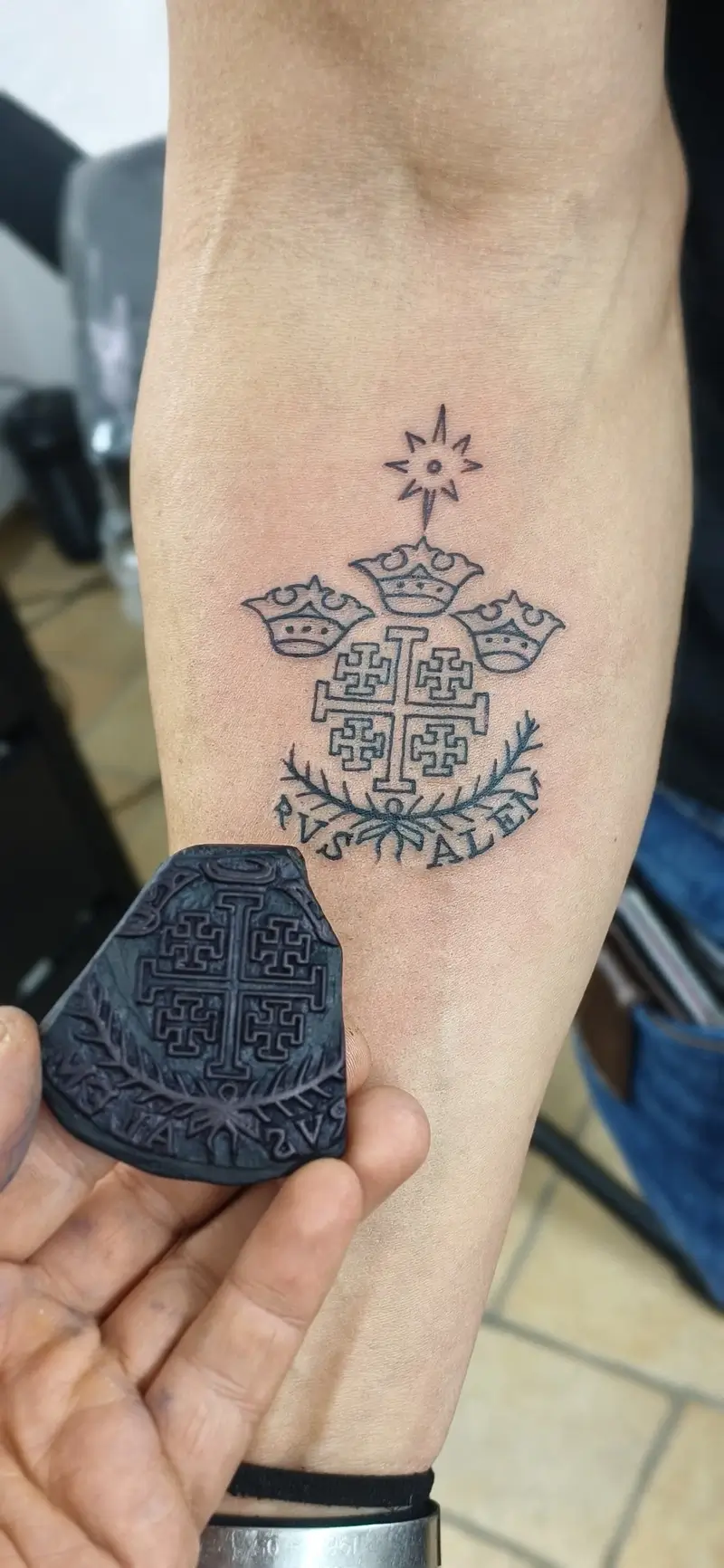 Today, the tradition continues in the Old City of Jerusalem, where Razzouk Tattoo blends centuries-old heritage with modern tattoo craftsmanship. The studio is especially known for preserving the use of ancient hand-carved wooden tattoo stamps which date back hundreds of years. These historic stamps are still used to apply traditional Coptic and Christian designs before tattooing, allowing pilgrims to receive a symbol that connects them directly to generations of history.