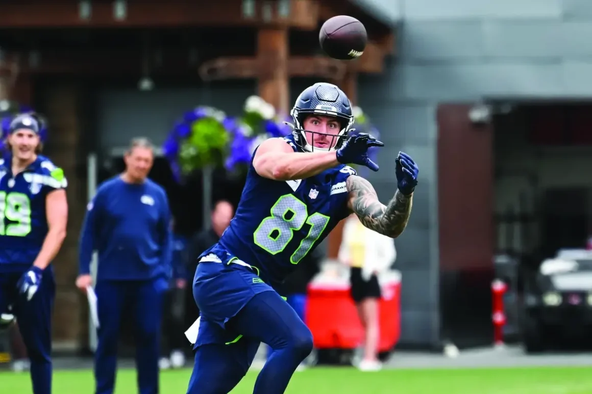 Meanwhile, on the opposite side of the practice field, Saubert, the most experienced tight end on the roster, was sharing insight with his fellow position players. Much like the team’s starting quarterback, Sam Darnold, and offensive coordinator at the time, Klint Kubiak, Saubert had previous stops with the San Francisco 49ers and other teams that ran similar personnel packages to the wide-zone running plays that distinguish the Shanahan-McVay offense. His ability to interpret the terminology for the newly installed offense made him a go-to communicator for his younger teammates.