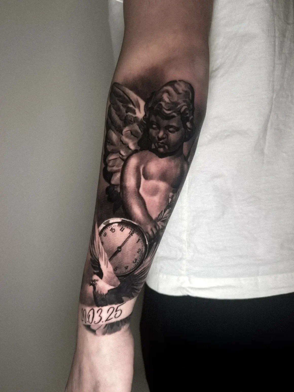 His approach to black and grey realism is built around mood and structure. Likeness matters, but it’s only the starting point. He pushes depth through contrast and lighting, shaping portraits so they feel lived in rather than copied. Each piece is designed to sit on the body with intention, reading clearly from a distance and rewarding closer inspection. Influences from artists like Dima Samokhin, Den Yakovlev, Robert Hernandez, and Denis Sivak helped sharpen his technical foundation, but the work has never drifted into imitation.