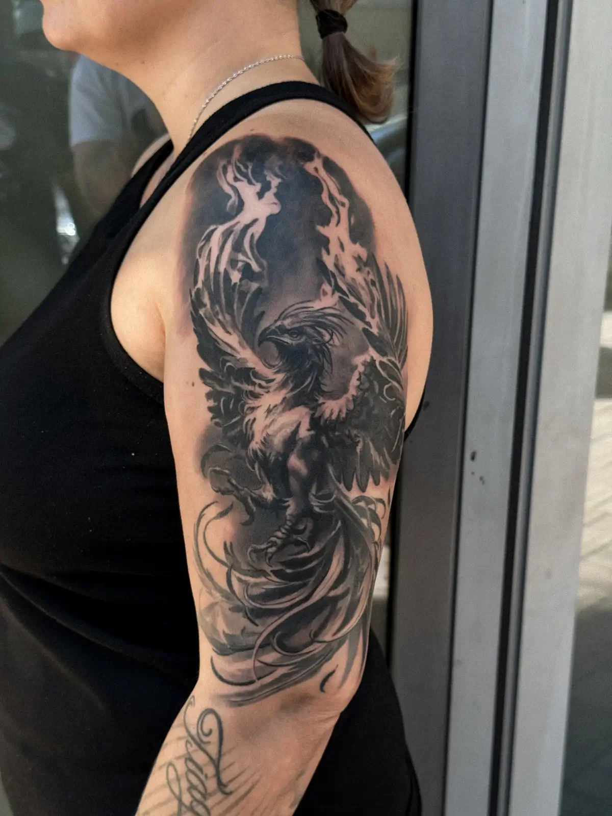He works with rotary machines for consistency and control, using nano liners and curved magnums to keep transitions smooth and intentional. Pigment choice is just as important. Clean, high quality black and grey inks allow the piece to age properly and hold contrast long after healing. Nothing is rushed. Every pass has a purpose.