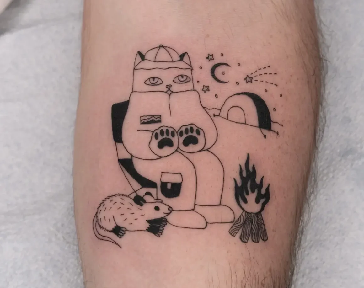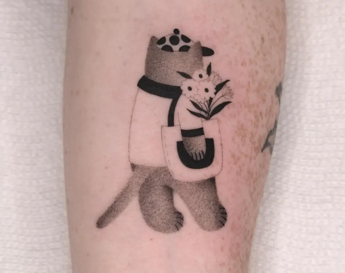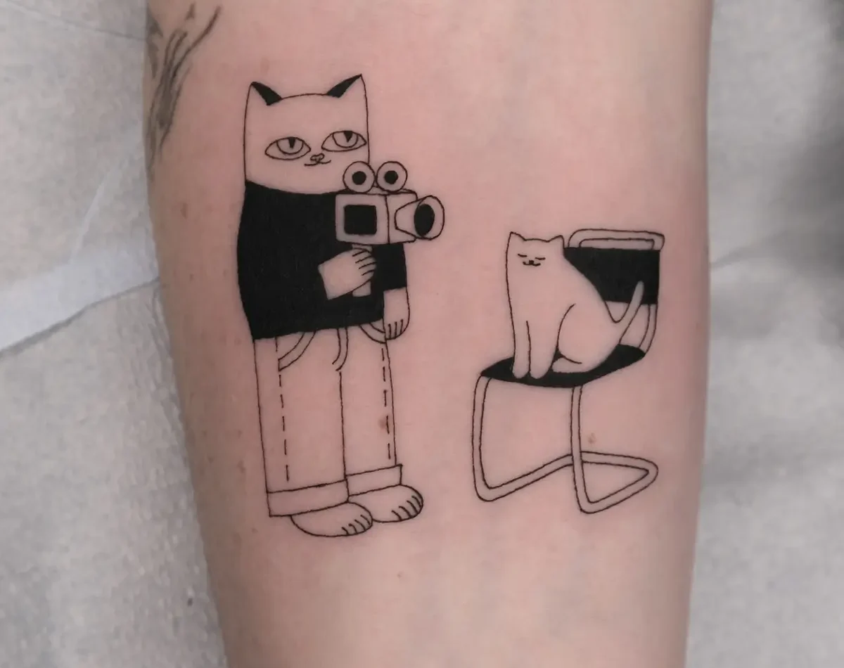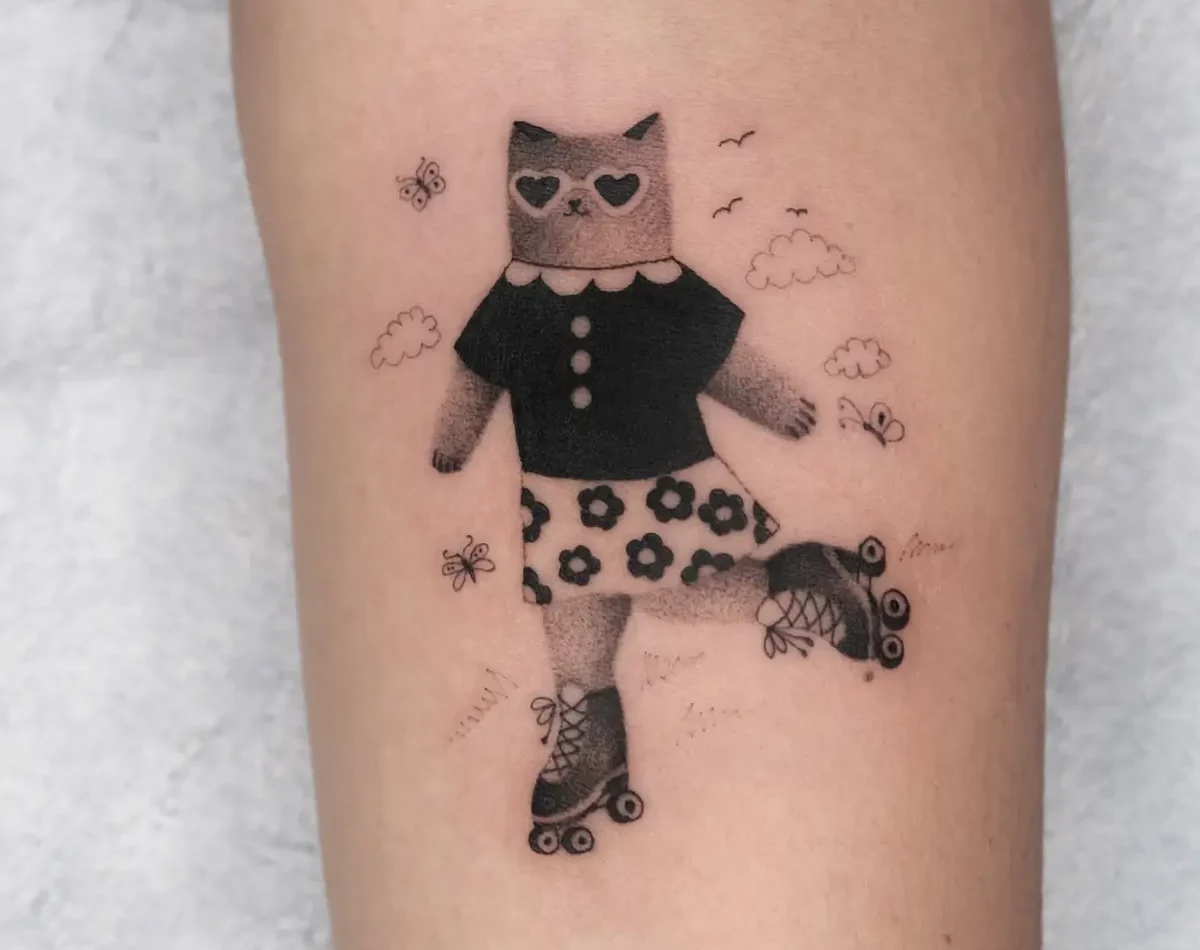 That emotional language is what makes her fine line work so recognizable. Katya is known for small, minimal tattoos that carry a surprising amount of feeling. Her characters, often cats with human-like gestures, capture quiet moments people connect to without needing explanation. “I show my inner vision of the world through these cats,” she says. “I take inspiration from what I see around me and recreate those stories through them.”