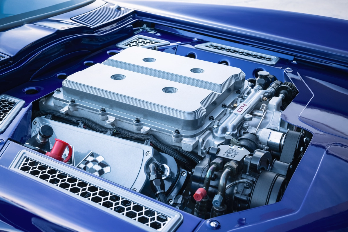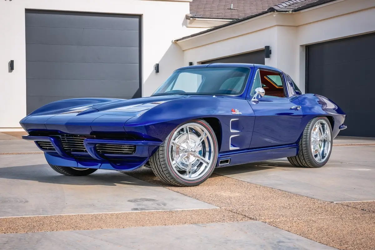Shope’s second offering, a 1963 Corvette Split-Window Widebody known as “Night Train,” Lot 1373, represents an even bolder vision. Finished in a deep, custom PPG Candy Blue, the car seems to glow from within, its paint shimmering across surfaces that have been completely reshaped. The build began with a 60,000-original-mile 1963 Corvette Split-Window body, which was removed from its chassis and transformed through an extensive fabrication process. A fully handcrafted widebody kit reshaped the iconic lines, and the body was worked inside and out before receiving its show-quality finish, polished to a near-liquid shine.