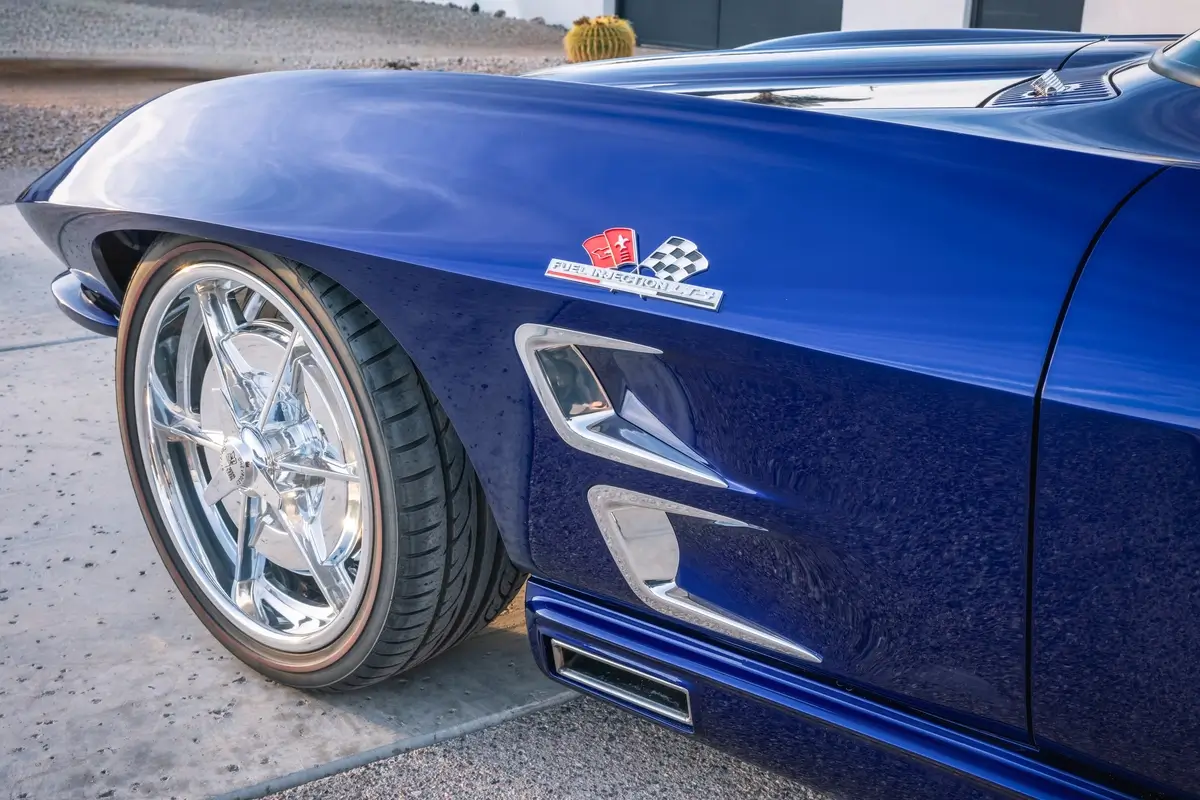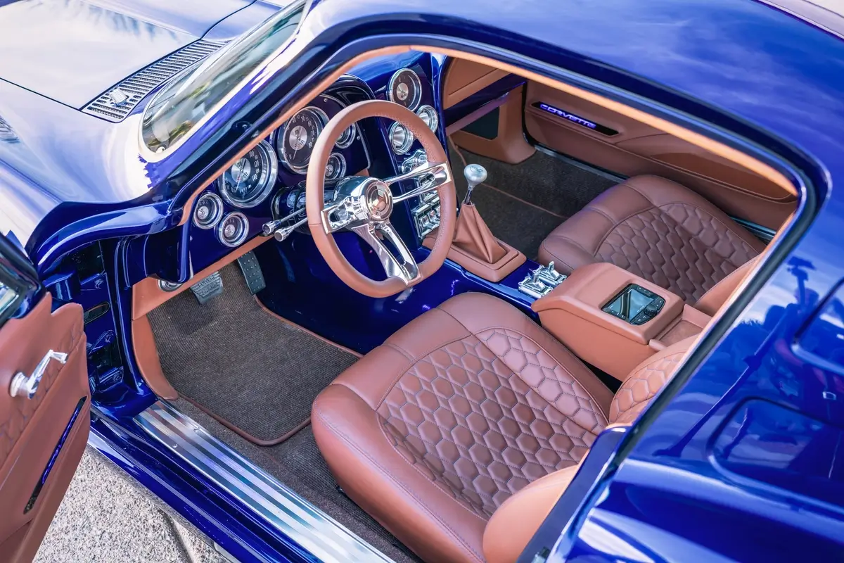 Beneath the custom hood lies serious performance: a Texas Speed–built LT4 engine producing over 700 horsepower. It exhales through a switch-controlled stainless-steel exhaust system that can route its sound through the center rear or behind the front wheels at the push of a button. Power is delivered through GM’s eight-speed automatic transmission, and the entire build rides on a Roadster Shop chassis with every component finished in Burnt Silver powder coat. Brembo power disc brakes ensure confident stopping performance, while power steering adds everyday usability. A set of one-off Curtis Speed wheels, measuring 19 inches up front and 20 inches in the rear, completes the stance. Their design was inspired by the original 1963 hubcaps but reimagined for a wider, more aggressive footprint.