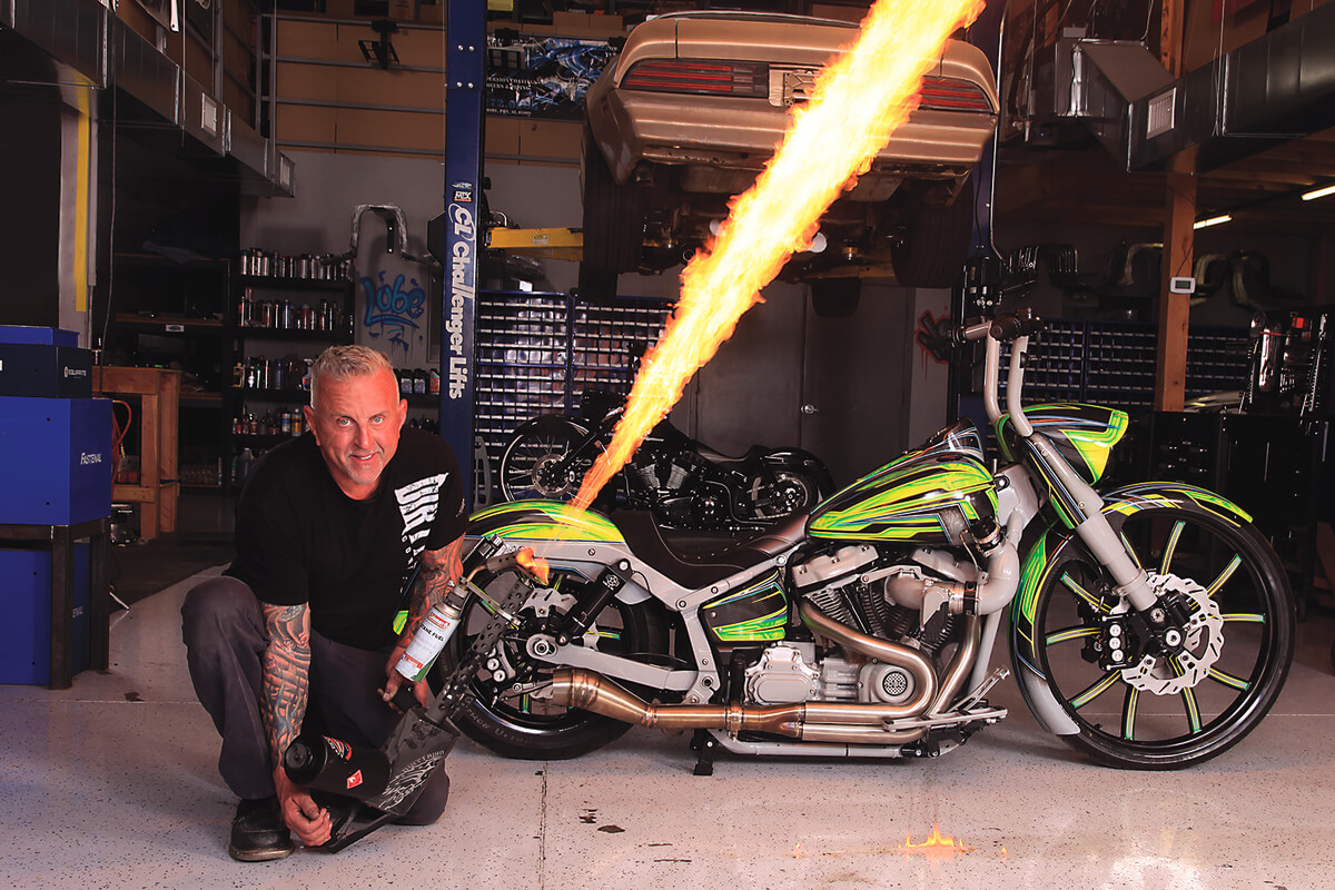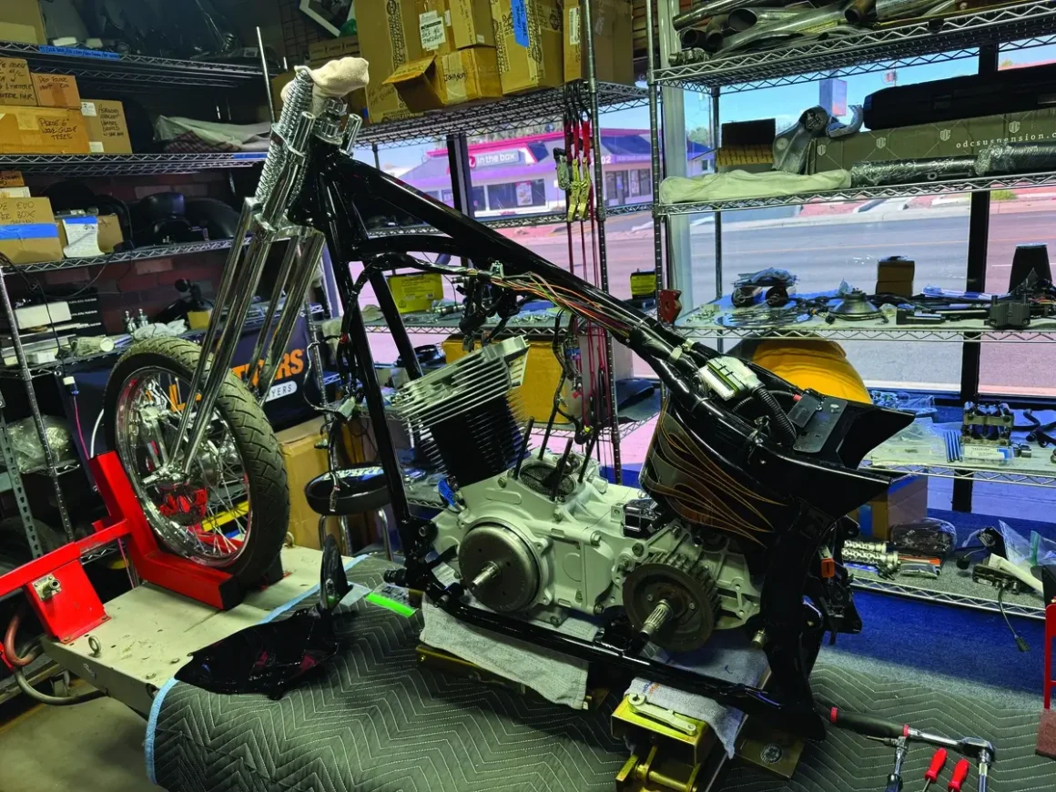 “I decided to take a bike and put a Springer on it — get a long Springer, chop the frame up, stretch it, change the geometry of it, and make it a full custom,” Yaffe explains. At press time, the bike’s gold-flame paint job had just been completed, and reassembly was underway.