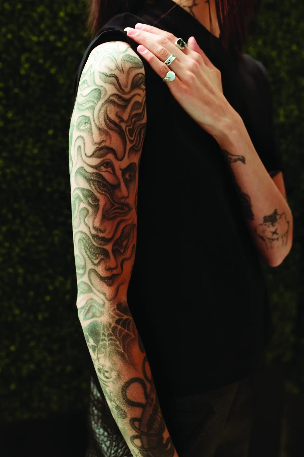 REZZ’s creative expression extends to her skin. Her tattoo journey began in high school when a friend drew a synthesizer design that she later had inked as her first tattoo. Since then, her collection has grown to feature captivating motifs, psychedelic imagery, and tributes to her favorite horror themes. Artists like Corey Divine and Adam Vu Noir have helped bring her vision to life, including a striking sleeve adorned with multiple eyes, which has become a fan favorite.