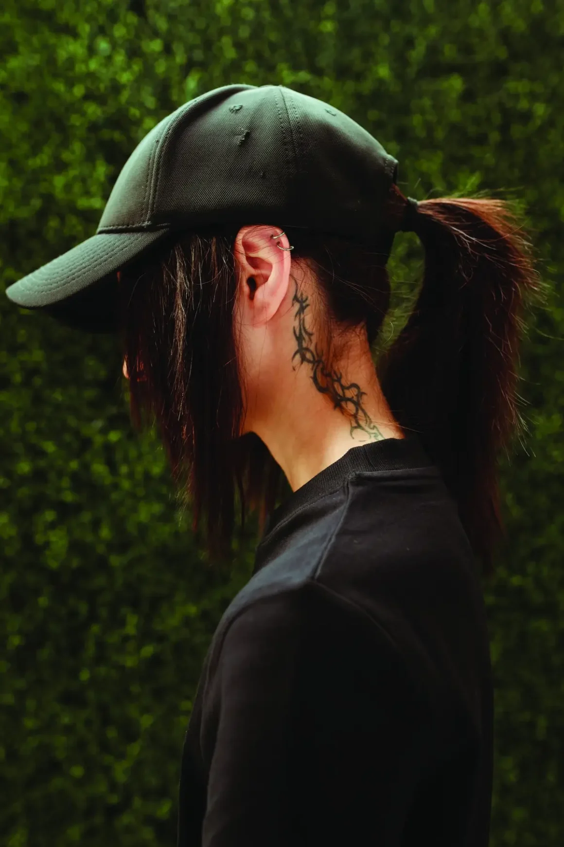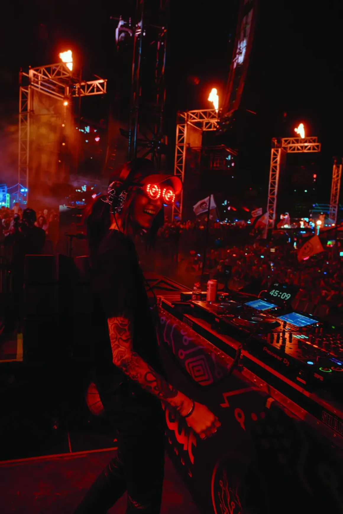 Her fanbase, better known as “The Cult of REZZ,” has evolved into a movement centered around shared identity and visual devotion. At her shows, fans wear LED goggles, custom jackets, and REZZ tattoos, all serving as symbols of their allegiance. These fans are dedicated followers who travel across borders to attend her performances and proudly display her iconography on their bodies. “They’re super awesome,” she says. “It feels great that they’ve all become friends with each other through the community. The devotion and the tattoos are amazing.”